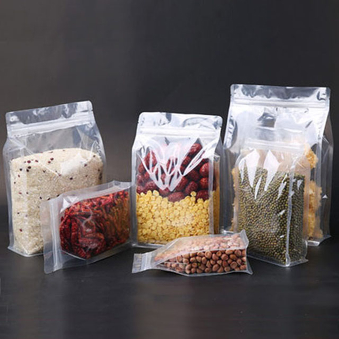 پلاسٹک فلیٹ باٹم زپر بیگ کلیئر/فروسٹڈ، بی او پی پی لیمینیشن فلم کامل رکاوٹ بناتی ہے، ہوا، مائع وغیرہ کے کٹاؤ کو روکتی ہے۔ مربع مہر کا ڈھانچہ سگ ماہی کو مضبوط بناتا ہے۔